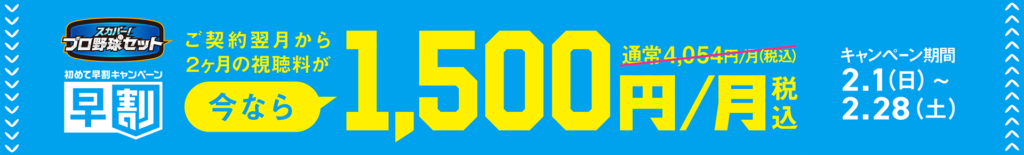- キャンペーン内容: 2026年2月中にスカパー!に新規加入し、同時に「プロ野球セット」を契約すると、**加入翌月から2ヶ月間の視聴料が月額1,500円(税込)**となります。