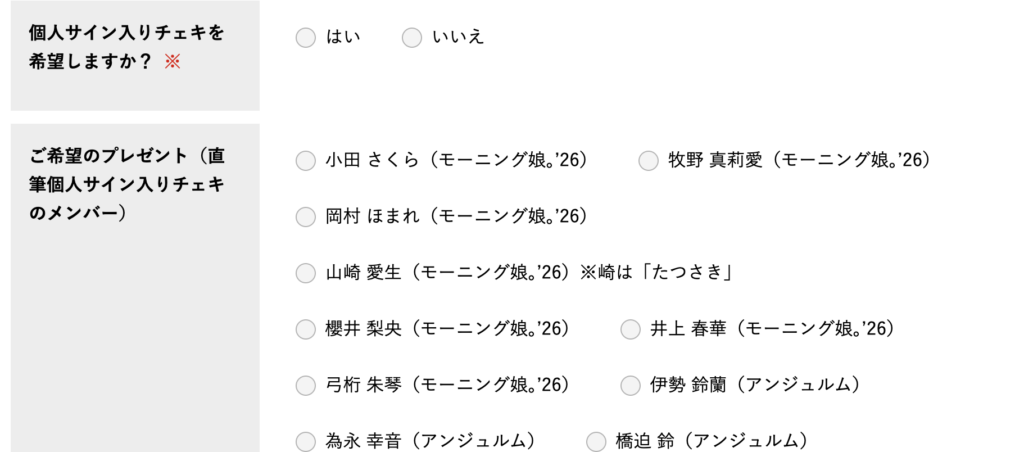 個人サイン入りチェキを希望しますか?の問いに「はい」を選択し、「サイン入り個人チェキ」を希望するメンバーをリストから選択します。 ソロフェスのパフォーマンスを観た後でしたら、さらに迷ってしまうかもしれませんが、魂を込めて選びましょう。
